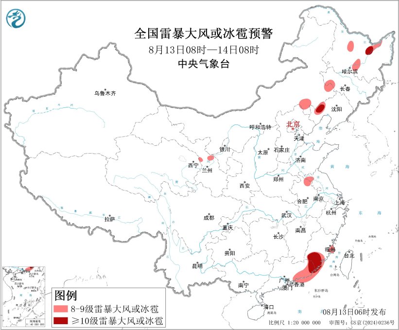 預計8月13日08時至14日08時,內蒙古東南部、東北地區北部和西部、蘇皖北部、華南東部等地的部分地區將有8級以上雷暴大風或冰雹天氣,其中,黑龍江東北部、遼寧西部、福建南部、廣東東部等地的部分地區將有10級以上雷暴大風,最大風力可達11級以上;內蒙古東南部、東北地區北部和西部、江淮西部和北部、江漢、江南北部和西部、西南地區東部和南部、華南等地的部分地區將有小時雨量大於20毫米的短時強降水天氣,其中,福建南部、廣東東部等地的部分地區小時雨量大於50毫米,最大可達70毫米以上。