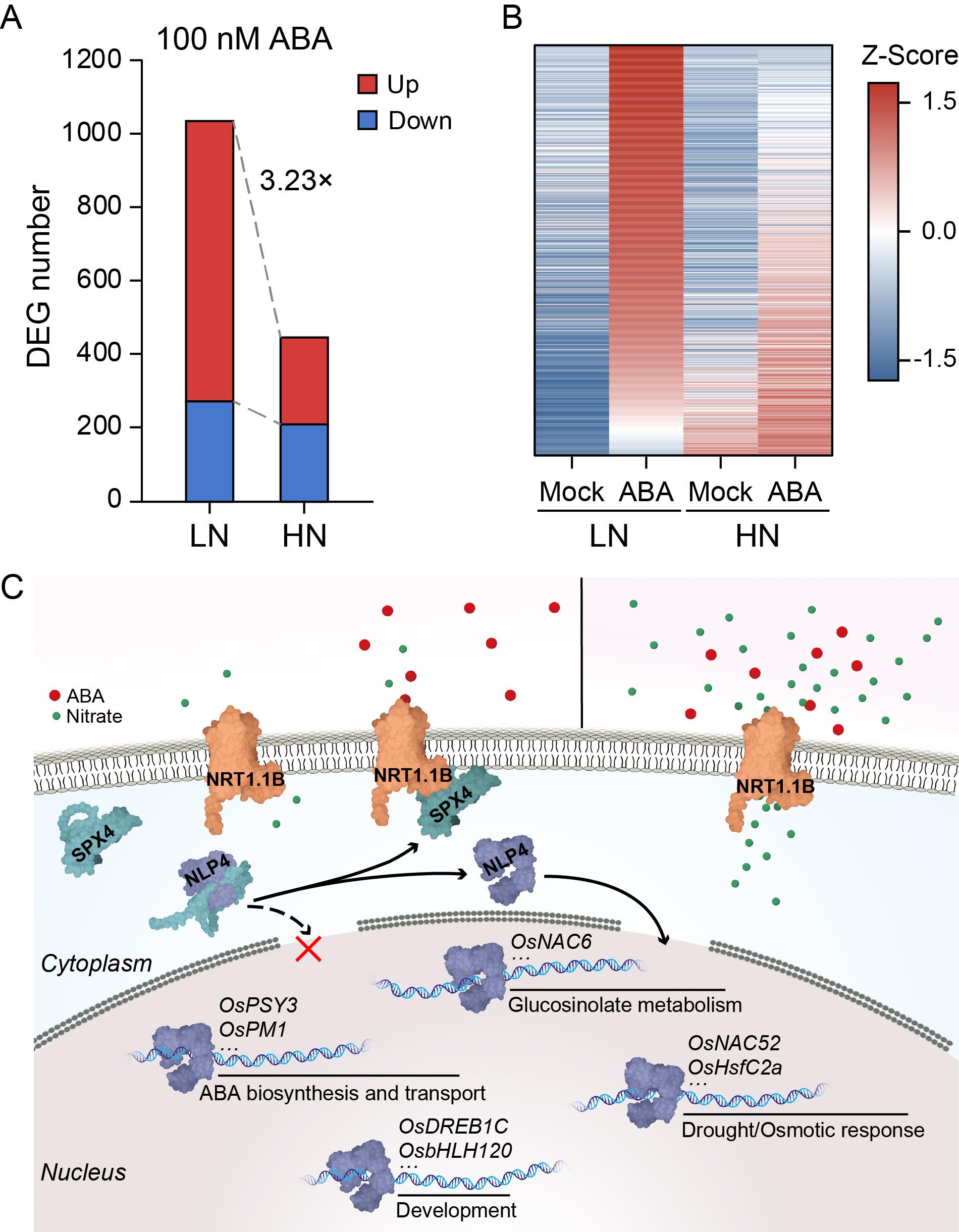 循着此線索,研究團隊進一步發現,NRT1.1B可以作為植物逆境激素脱落酸的受體,感知與整合氮元素與脱落酸之間的信號。在低氮環境下,水稻對生理濃度脱落酸的轉錄響應十分劇烈;而在高氮環境下,這種轉錄響應則受到顯著抑制。“低氮條件下可觸發更為活躍的脱落酸響應,這也暗示植物體內存在能夠整合氮營養狀態和脱落酸信號的分子機制,植物能根據氮營養的狀態,調整對逆境的‘敏感度’。”儲成才説。