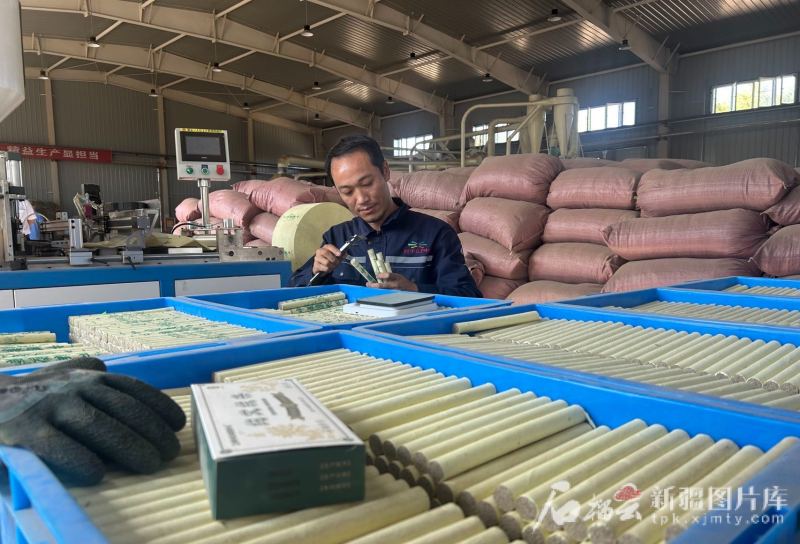 8月11日,陳江在艾草加工廠對即將出廠的艾絨條進行檢測。石榴雲/新疆日報記者 宋衞國 攝