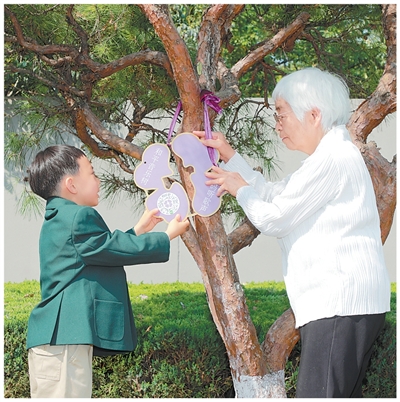 3月25日,大門高子(右)與南京紫金草童聲合唱團團員一同將二維碼圖標系在“和平音樂樹”樹幹上,人們可以掃碼收聽歌曲《和平的花 紫金草》。