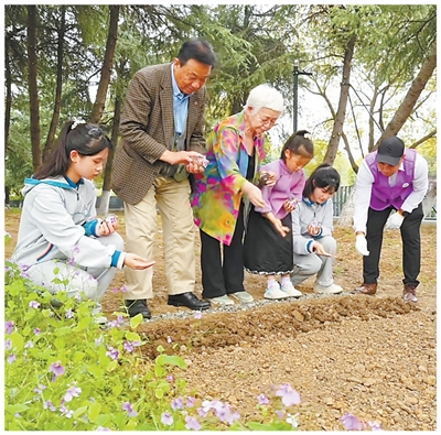 大門高子(左三)在侵華日軍南京大屠殺遇難同胞紀念館紫金草花園,與紫金草國際志願者共同播種紫金草。
