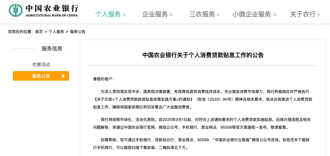 具體來看,農業銀行公告提到,將按照市場化、法治化原則,自2025年9月1日起,對符合上述通知要求的個人消費貸款實施貼息。