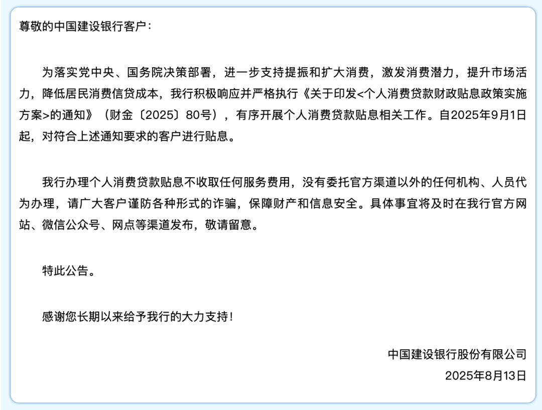建設銀行公告提到,為落實黨中央、國務院決策部署,進一步支持提振和擴大消費,激發消費潛力,提升市場活力,降低居民消費信貸成本,我行積極響應並嚴格執行《實施方案》,有序開展個人消費貸款貼息相關工作。自2025年9月1日起,對符合上述通知要求的客户進行貼息。
