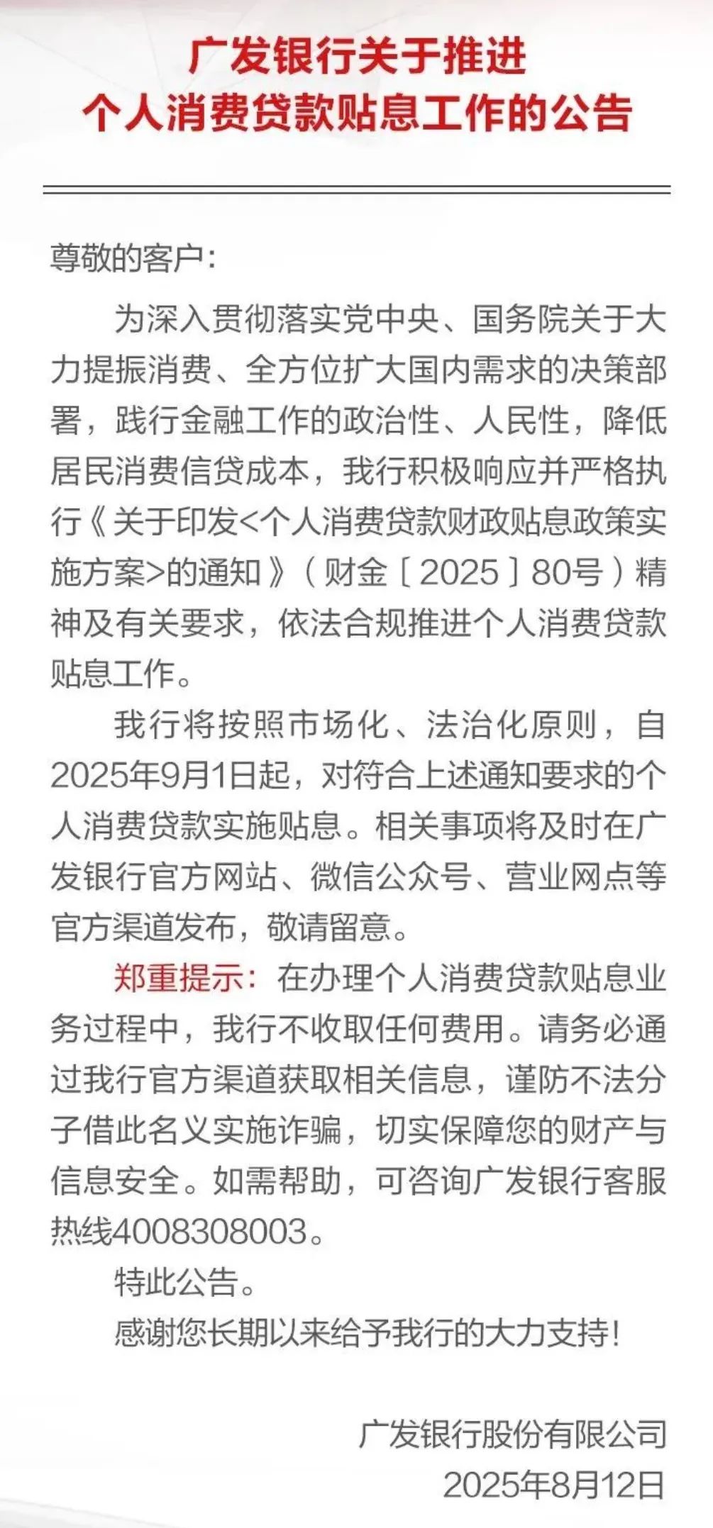 廣發銀行公告提到,將按照市場化、法治化原則,自2025年9月1日起,對符合通知要求的個人消費貸款實施貼息。