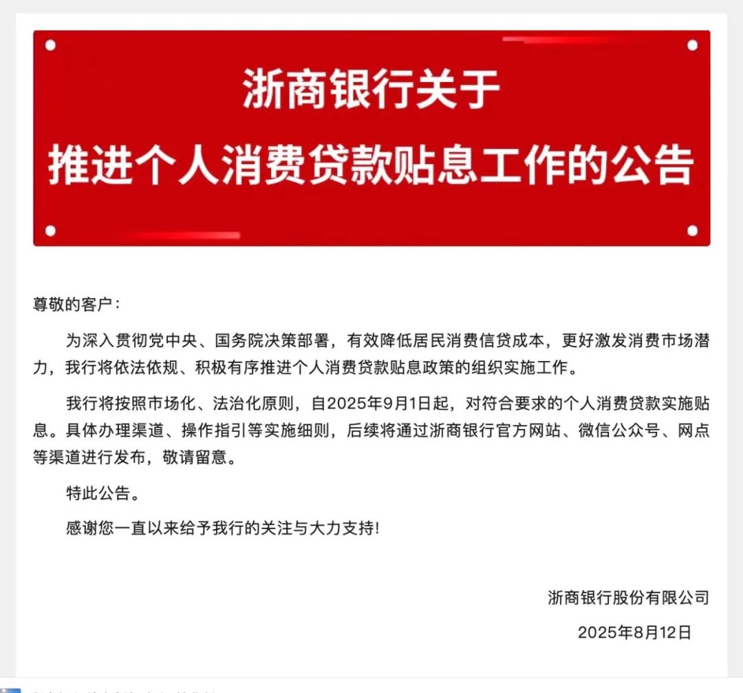 浙商銀行公告顯示,將依法依規、積極有序推進個人消費貸款貼息政策的組織實施工作。該行將按照市場化、法治化原則,自2025年9月1日起,對符合要求的個人消費貸款實施貼息。