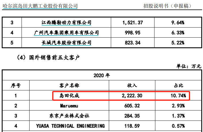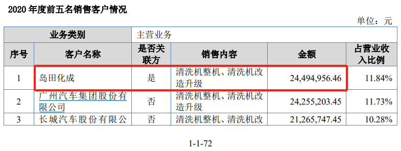 另據經營信息披露,島田化成株式會社原為大鵬工業的境外經銷商,大鵬工業藉助其向三菱汽車等大型汽車集 團提供工業精密清洗裝備和裝備升級改造服務;同時,島田化成是公司歷史股東,其實際控制人之子島田遼二郎為公司報告期內曾控股子公司島田化工機的少數股東,因此,公司將島田化成比照關聯方進行披露。