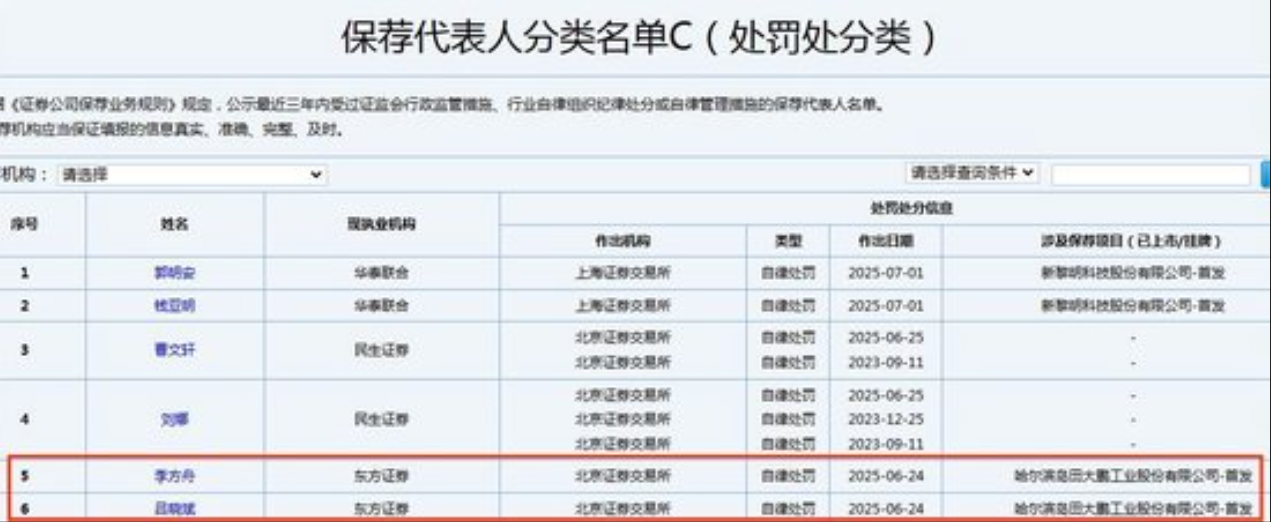 公開信息披露顯示,大鵬工業此次申請在北交所IPO,保薦機構為東方證券(600958.SH),保薦代表人為呂曉斌、李方舟,今年7月,在中國證券業協會發布的保薦代表人分類名單C(處罰處分類)中,上述2位東方證券的保薦代表人,均因在哈爾濱島田大鵬工業股份有限公司IPO項目中履職違規,被採取自律監管措施。