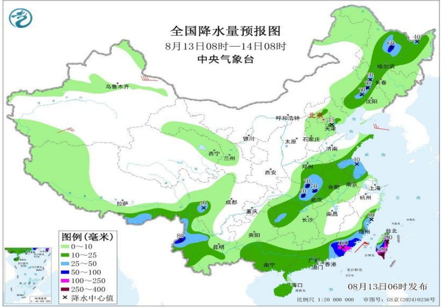 8月13日8時至14日8時,黑龍江中部、吉林西部、遼寧西部、河南南部、湖北中部、江蘇北部、雲南西部、廣東東部、福建東部和南部、西藏南部、台灣島大部等地部分地區有大到暴雨,其中,福建東南部、廣東東南部、台灣島東部和南部等地部分地區有大暴雨,台灣島東部和南部等地局地特大暴雨(250~390毫米)。中央氣象台8月13日6時繼續發佈颱風黃色預警和暴雨黃色預警。