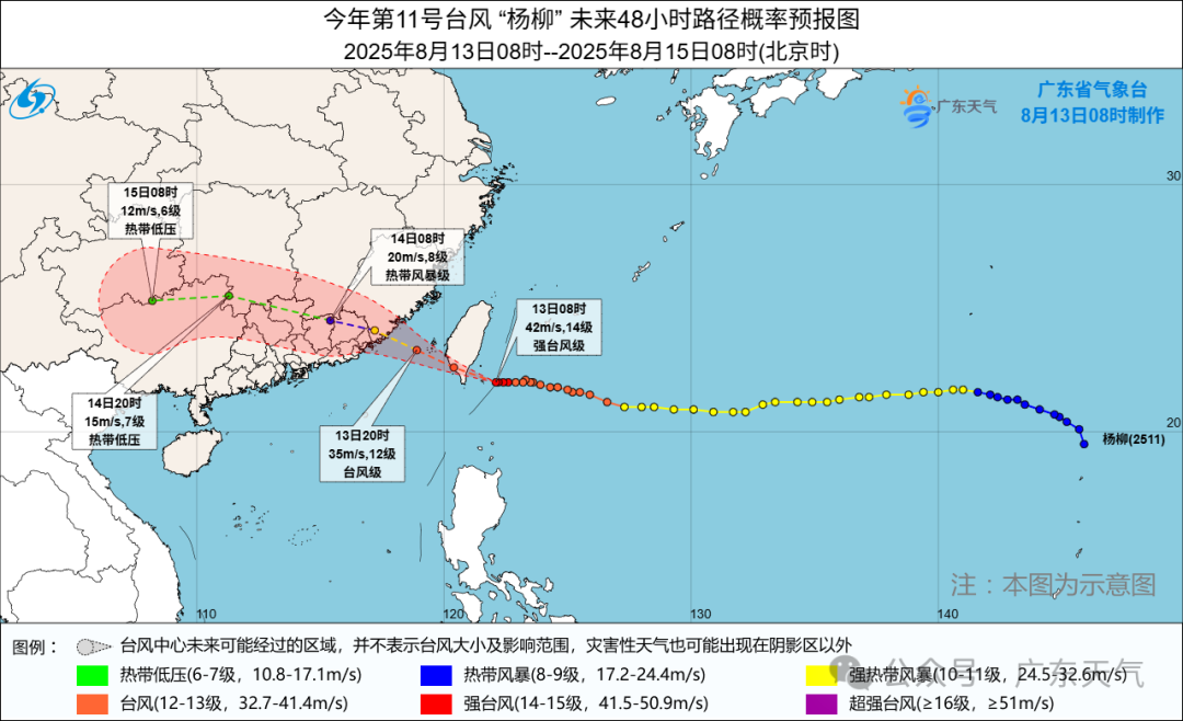 颱風“楊柳”預計8月14日穿過廣東北部,受其影響,深圳有大雨到暴雨局部大暴雨,雨時陣風7—8級,高温天氣緩解。請提前做好各項颱風防禦措施,注意防禦強降水帶來的城市積澇、山體滑坡等災害;户外活動、高空作業、建築工地和濱海和海上活動還需防範雷電、短時大風等強對流天氣的影響。