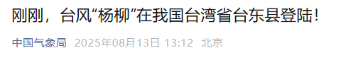 *今年第11號颱風“楊柳”(強颱風級)的中心已於今天(8月13日)13時前後在我國台灣省台東縣太麻里鄉沿海登陸,成為今年以來登陸我國的最強颱風。*登陸時中心附近最大風力14級(42米/秒),中心最低氣壓955百帕。
