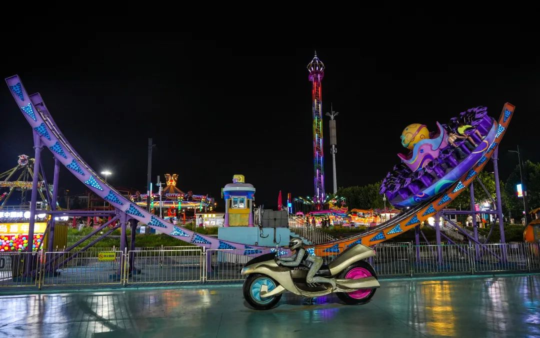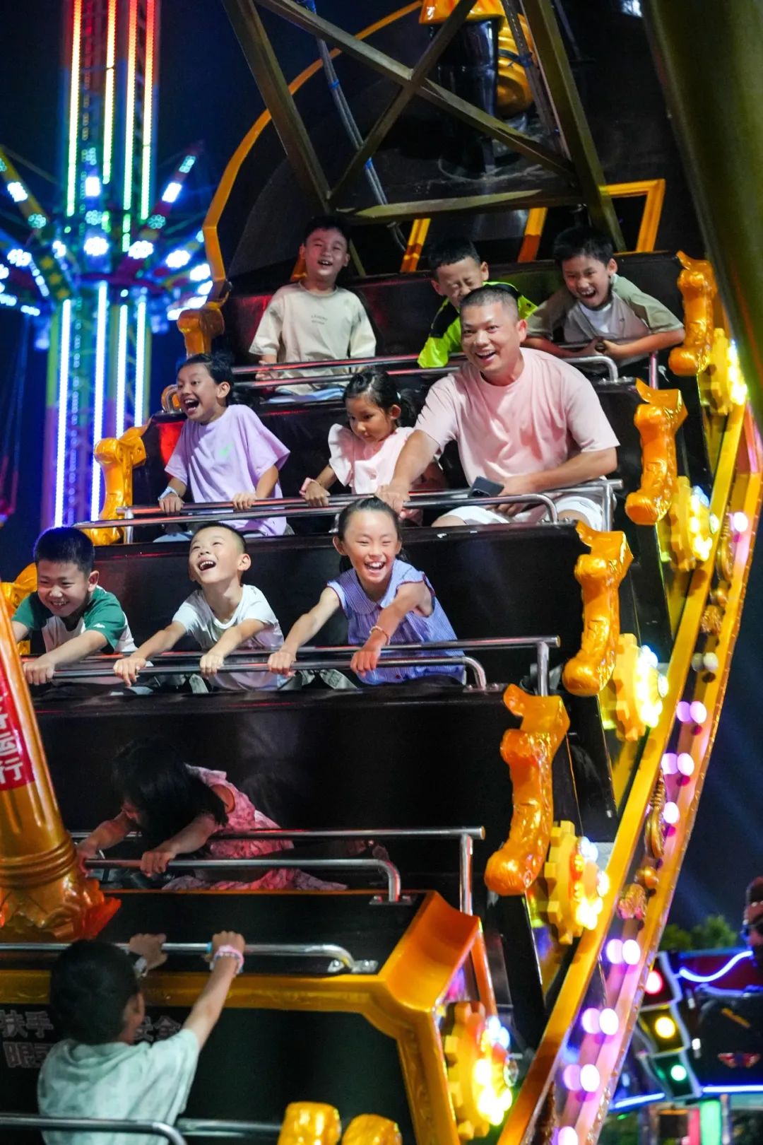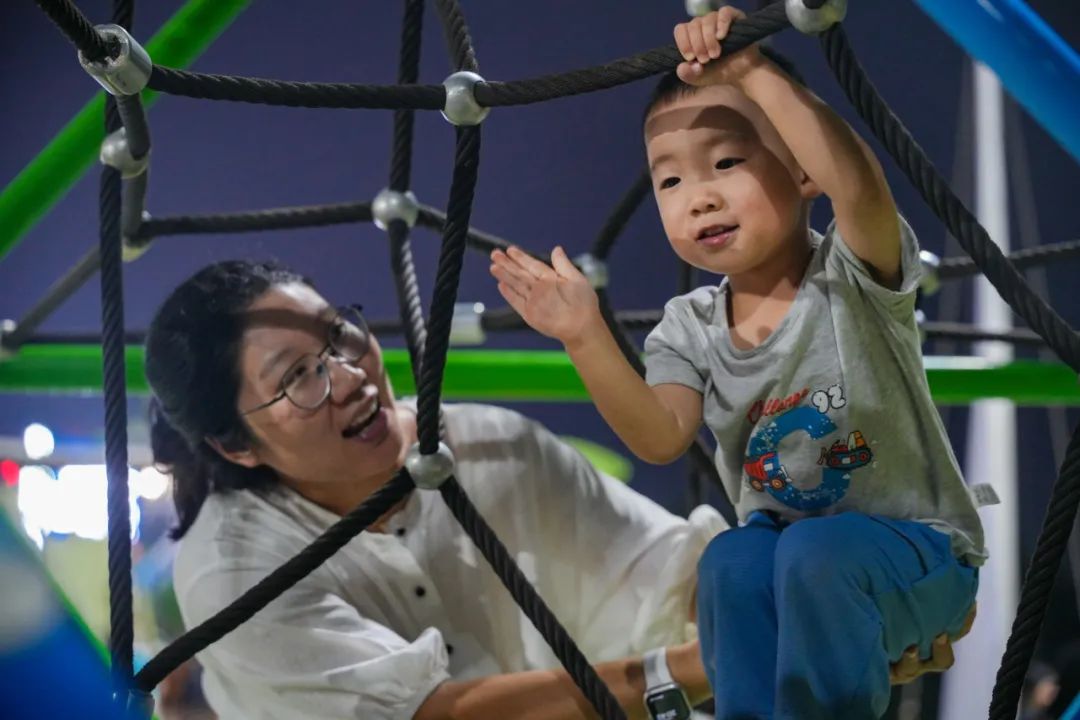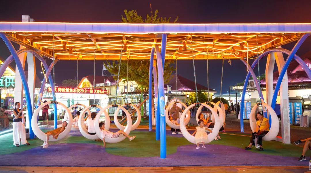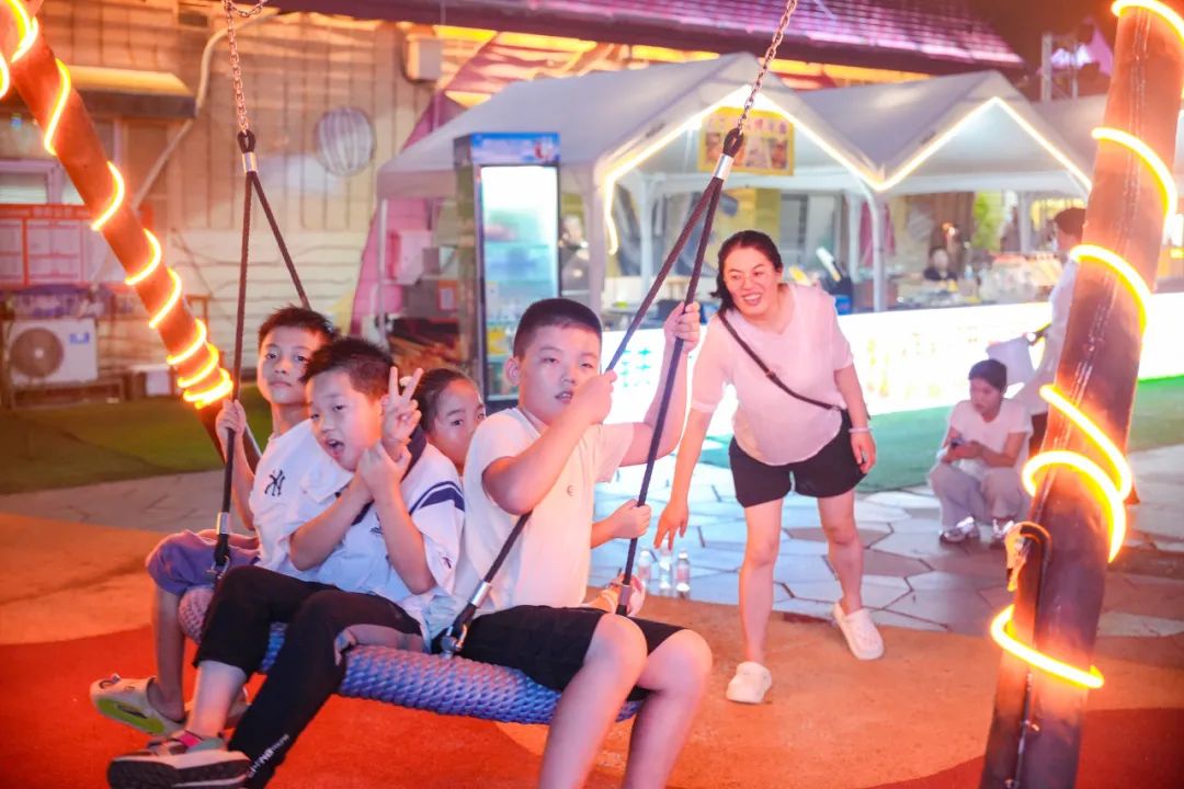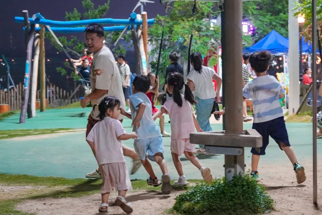 遊樂設施周圍搭配了燈光與燈帶,夜晚亮起時像撒了一地星星,鞦韆蕩過帶起串串光點,連蹺蹺板起落間都晃着暖黃的光暈,讓孩子們白天玩得盡興,傍晚也能在光影裏續上一份熱鬧。