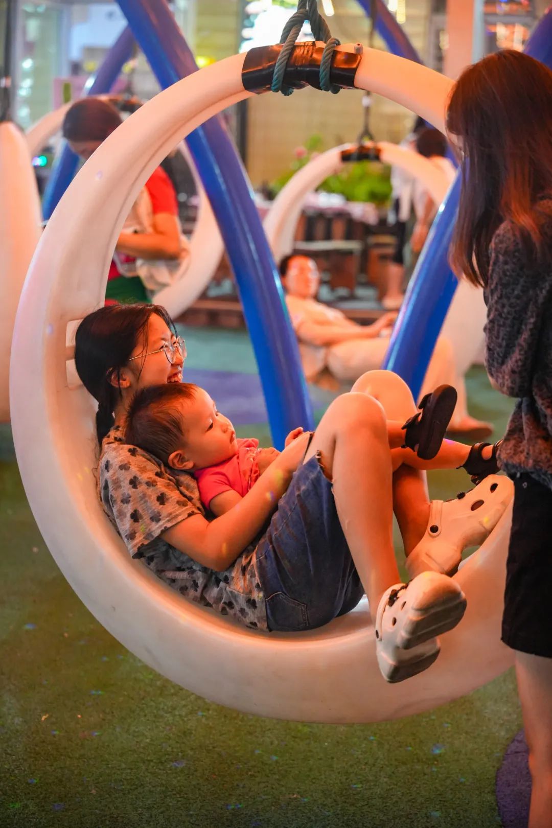 在鳳凰裏休閒美食街區,更有月光鞦韆、六人蹺蹺板、恐龍搖搖樂、雙聯滑索等錯落其間,為孩子們勾勒出一片自在嬉戲的天地,讓每一刻奔跑與歡笑都浸着無憂無慮的甜。