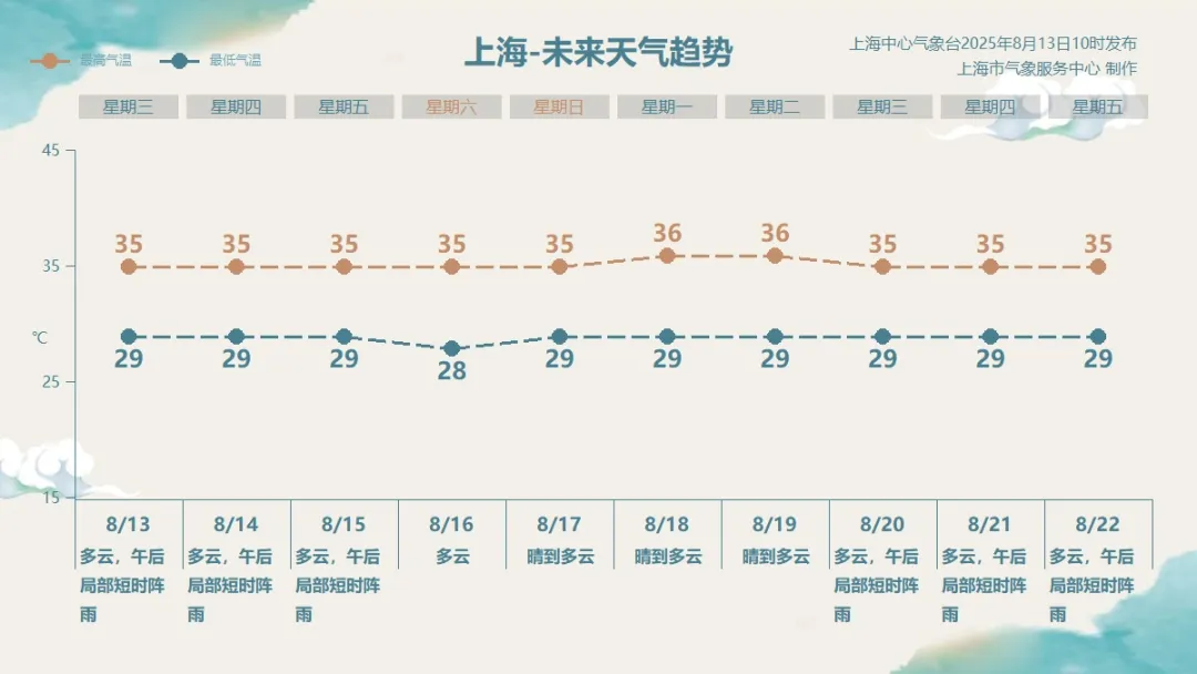 申城今天多雲為主,午後出現局部短時陣雨的可能性減小。上海中心氣象台於9時20分發布高温黃色預警信號,預計今天的最高氣温可達35℃。氣温數值上比前兩天稍低一些,主要得益於陣陣南到東南風帶來海上相對清涼的空氣,悶熱體感也會較前期有所緩和。