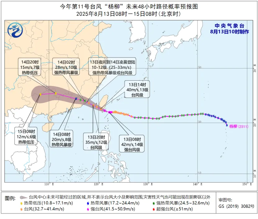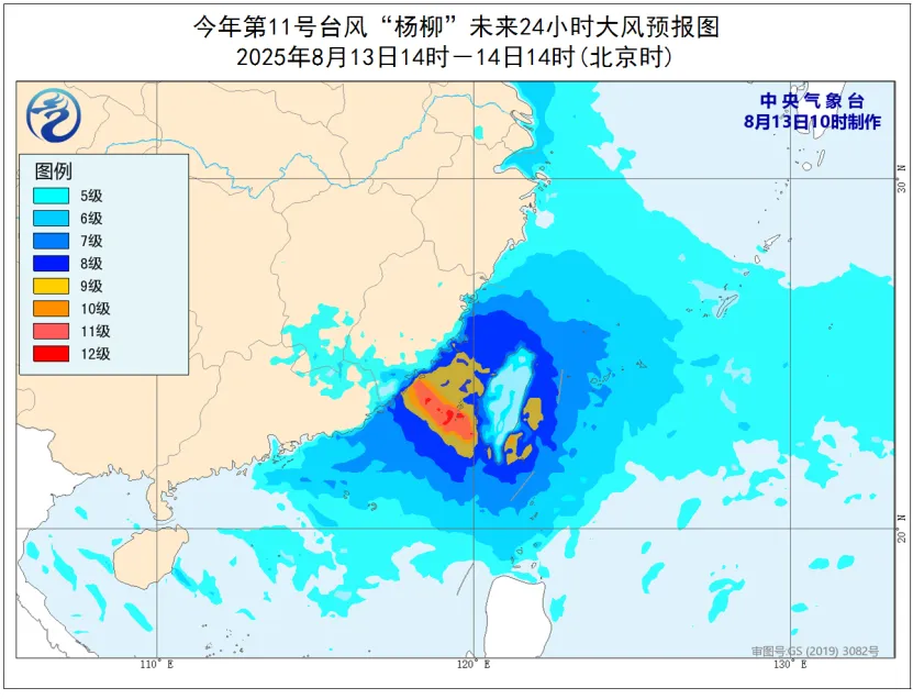 今年第11號颱風“楊柳”(強颱風級)的中心已於今天(8月13日)13時前後在台灣台東縣太麻里鄉沿海登陸,登陸時中心附近最大風力14級(42米/秒),中心最低氣壓955百帕。