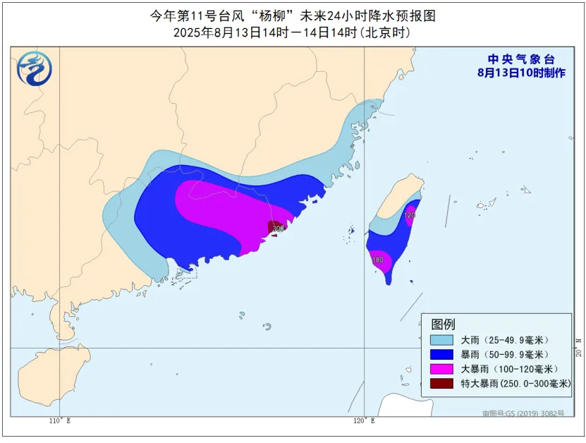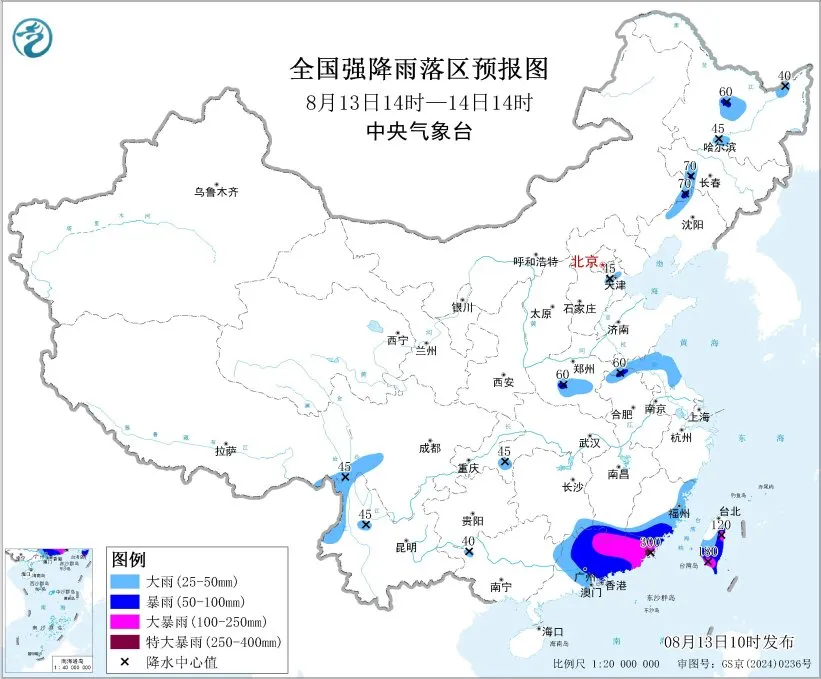 預計,8月13日14時至14日14時,廣東中東部、福建東部和南部、江西南部、湖南東南部、台灣島大部以及黑龍江中部、吉林西部、遼寧西北部、河南南部、安徽北部、江蘇北部、湖北西南部、重慶東南部、雲南西北部等地的部分地區有大到暴雨,其中,福建南部、廣東東部和北部、江西南部、台灣島東部和南部等地的部分地區有大暴雨,廣東東部、福建東南部等地局地特大暴雨(250~300毫米)。上述部分地區伴有短時強降水(最大小時降雨量20~50毫米,局地可超過70毫米),局地有雷暴大風等強對流天氣。