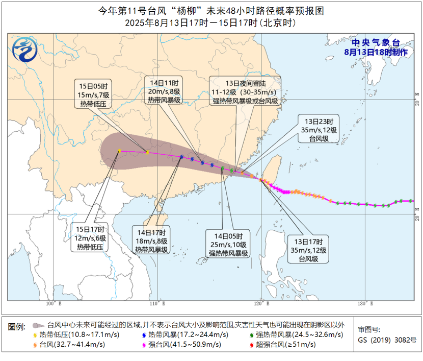今年第11號颱風“楊柳”的中心已於今天(8月13日)13時前後在台灣台東縣太麻里鄉沿海登陸,登陸時中心附近最大風力有14級(42米/秒,強颱風級),中心最低氣壓為955百帕,下午4點鐘其中心移入台灣海峽,5點鐘其中心位於福建漳浦縣東偏南方向大約260公里的台灣海峽海面上,就是北緯23.1度、東經119.9度,中心附近最大風力有12級(35米/秒,颱風級),中心最低氣壓為970百帕,七級風圈半徑為170~320公里,十級風圈半徑為80~100公里,十二級風圈半徑為50公里。