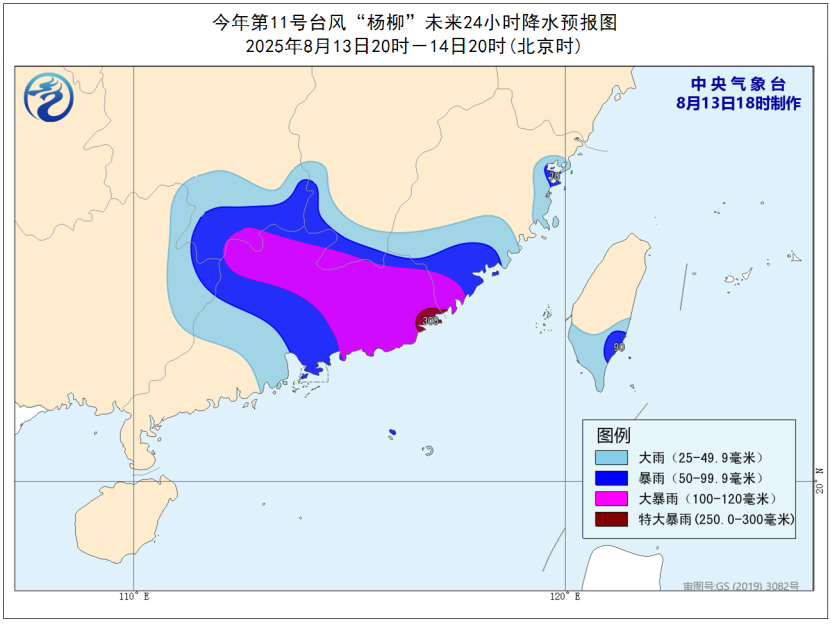 *降水預報:*8月13日20時至14日20時,廣東中東部和北部、福建東部和南部、江西南部、湖南南部、廣西東北部、台灣島南部等地有大到暴雨,部分地區大暴雨,其中,廣東東南部、福建東南部局地有特大暴雨(250~300毫米)。上述部分地區伴有短時強降水(最大小時降雨量20~50毫米,局地可超過70毫米),局地有雷暴大風等強對流天氣。