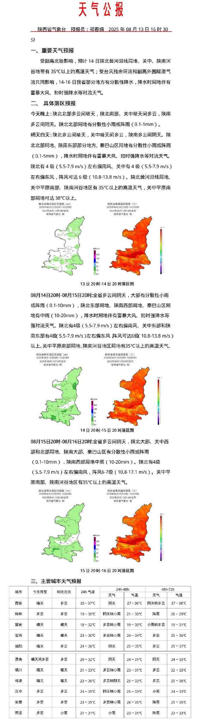 西安市氣象台2025年08月13日16時發佈天氣預報: