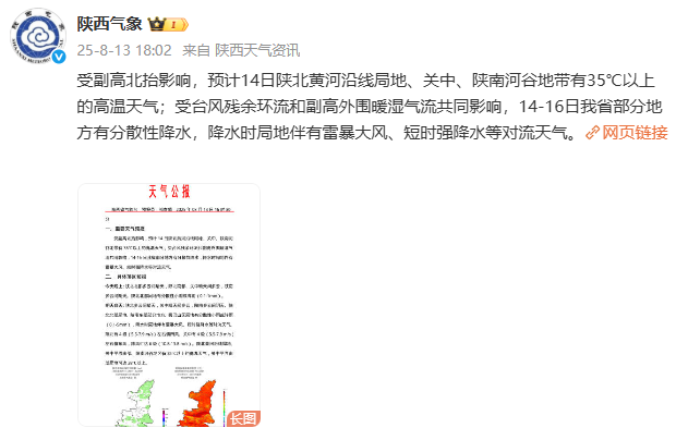 8月13日,陝西省氣象台發佈重要天氣預報,受副高北抬影響,預計14日陝北黃河沿線局地、關中、陝南河谷地帶有35℃以上的高温天氣;受颱風殘餘環流和副高外圍暖濕氣流共同影響,14-16日我省部分地方有分散性降水,降水時局地伴有雷暴大風、短時強降水等對流天氣。