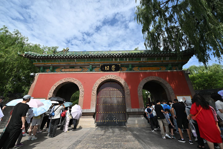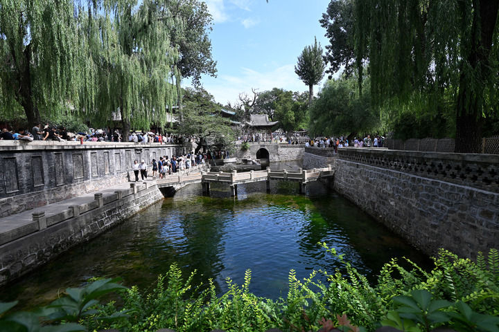 2025年8月7日,遊客在晉祠難老泉排隊觀泉。新華社記者 詹彥 攝