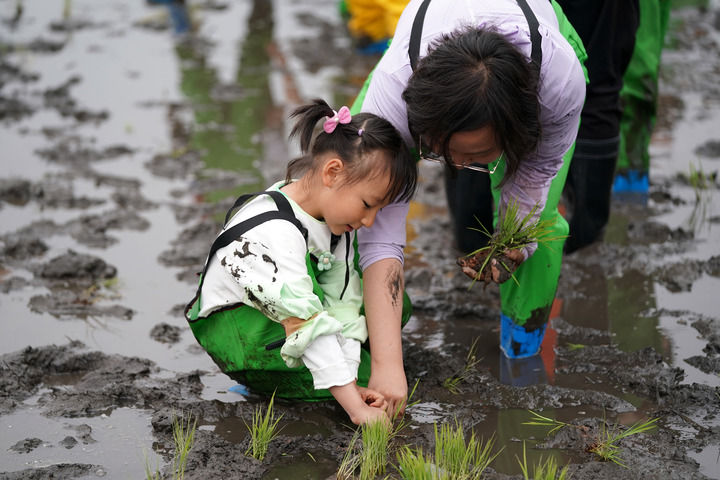2024年5月4日,在太原市晉源區晉祠鎮北大寺村的稻田裏,小朋友和家長在體驗插秧。新華社記者 詹彥 攝