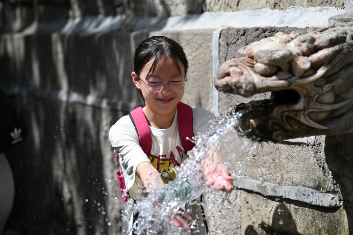 2025年8月7日,一名遊客在晉祠難老泉感受泉水的清冽。新華社記者 詹彥 攝
