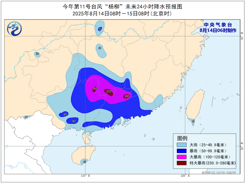 預計,8月14日08時至15日08時,廣東大部、廣西大部、福建東南部、江西南部、湖南中南部和西北部、貴州東部等地有大到暴雨,部分地區大暴雨,其中,廣東北部、廣西東北部、湖南南部、江西西南部等地局地有特大暴雨(250~280毫米)。上述部分地區伴有短時強降水(最大小時降雨量20~50毫米,局地可超過70毫米),局地有雷暴大風等強對流天氣。