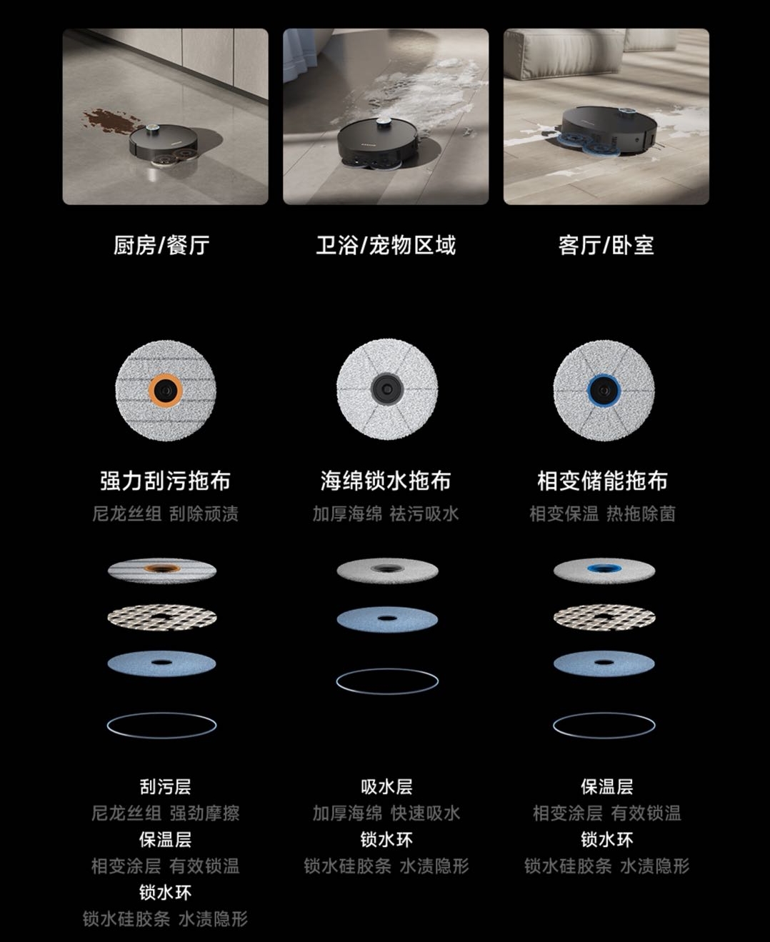 追覓Matrix10 Ultra掃地機搭載的智能換拖布系統,可以讓用户根據不同房間的功能屬性(如廚房、衞生間、客廳、寵物活動區)和地面材質(如瓷磚、木地板),自定義專屬拖布組,如A組用於廚房,B組用於衞生間,C組用於日常清潔。並且根據不同環境下的清潔要求,追覓掃地機對三組拖布的材質也做了專屬設計。