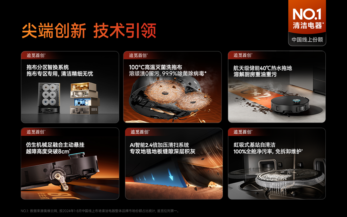此外,追覓Matrix10 Ultra還集成了諸多追覓首創的旗艦功能:標誌性的仿生機械足,讓產品擁有8cm的超強越障能力,在家庭場景中如履平地。100°C高温除菌煮洗拖布搭配基站自清潔,能有效清除拖布及底盤上的殘留污漬。25000Pa的超強吸力,則能輕鬆吸淨各種灰塵顆粒,實現全方位深度清潔。