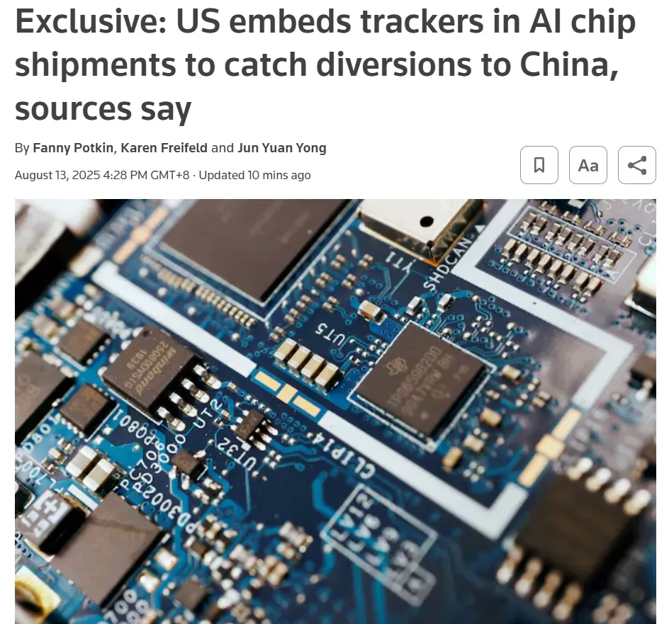 8月13日,路透社又刊發獨家報道爆料,美國秘密在人工智能相關芯片中設置追蹤器,以發現“芯片被轉運至中國的情況”。