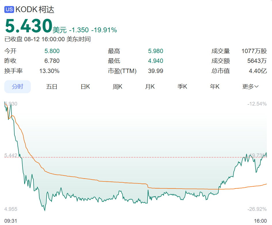 受此消息影響,當地時間12日,柯達股價一瀉千里,一度跌超26%,截至收盤跌19.91%。