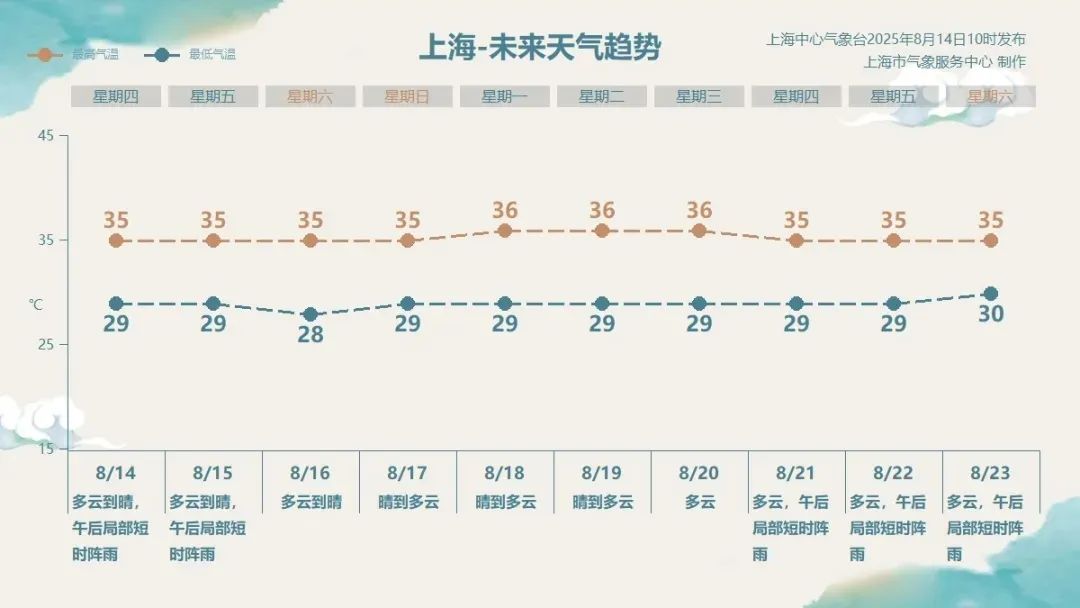 未來十天,上海將處於副熱帶高壓的強勢控制下,持續高温、晴熱少雨的天氣。好在大部分時間還是吹東南風,炎熱程度一般,總體天氣屬於“熱而不悶”。需要注意的是夜間氣温偏高,中心城區最低氣温在28℃以上,防暑降温工作不可鬆懈。