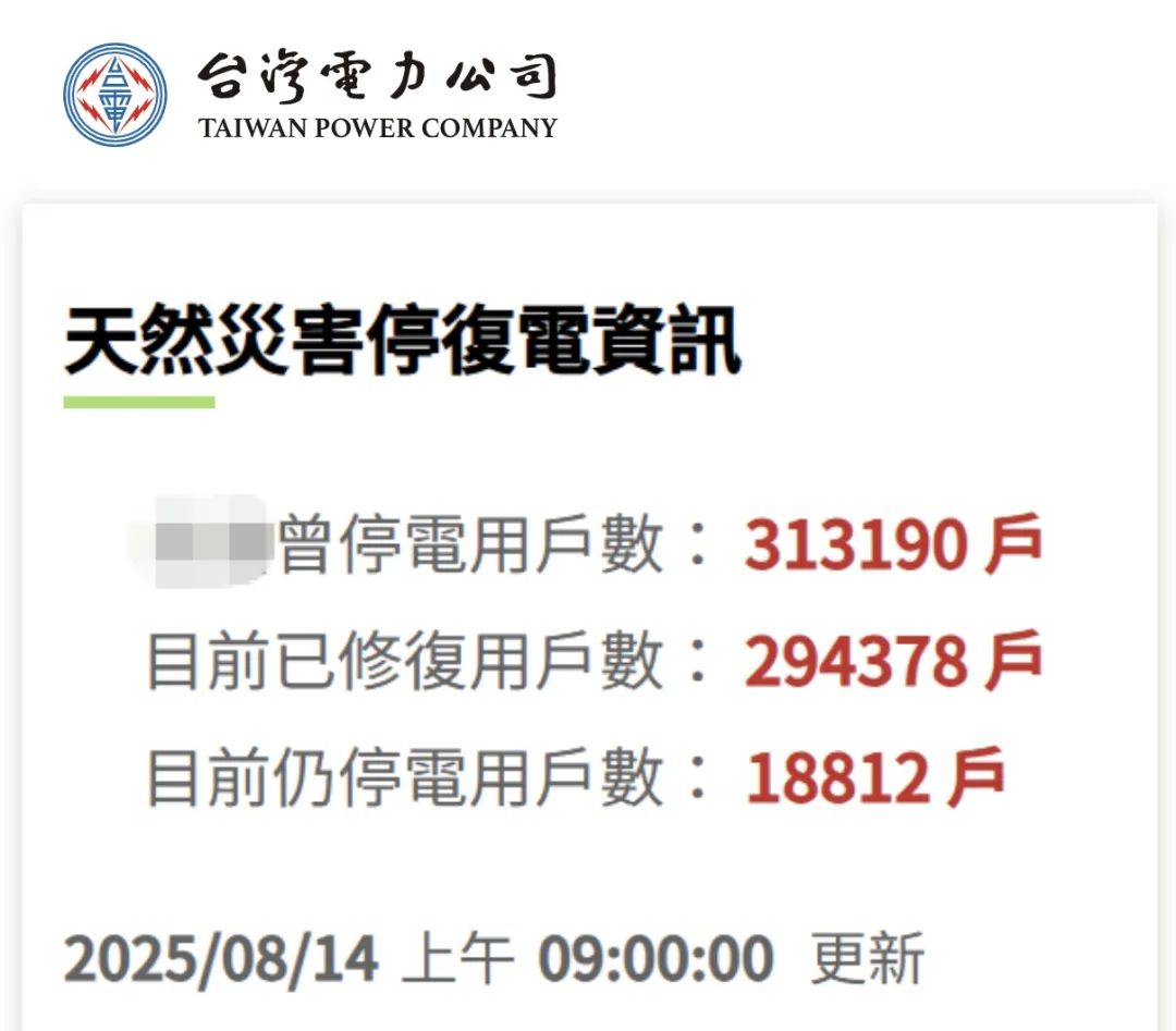 今年以來登陸我國的最強颱風“楊柳”(強颱風級)已逐漸遠離台灣島,台氣象部門於8月14日上午解除海上和陸上警報。據台媒報道,截至14日上午9時,颱風“楊柳”已造成全台1人死亡(高雄市)、1人失蹤(嘉義縣)、143人受傷,累計31.3萬户曾停電,數十條航線被取消。