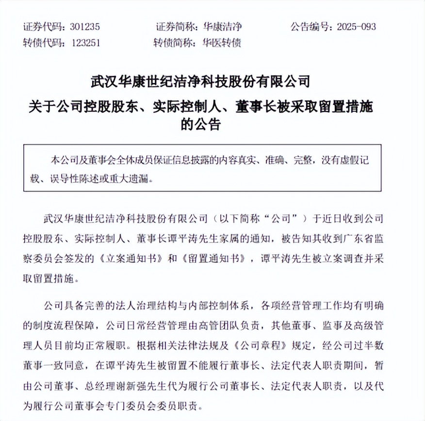 【環球網財經綜合報道】8月13日,華康潔淨公告稱,收到控股股東、實際控制人、董事長譚平濤家屬通知,譚平濤被廣東省監察委員會立案調查並採取留置措施。