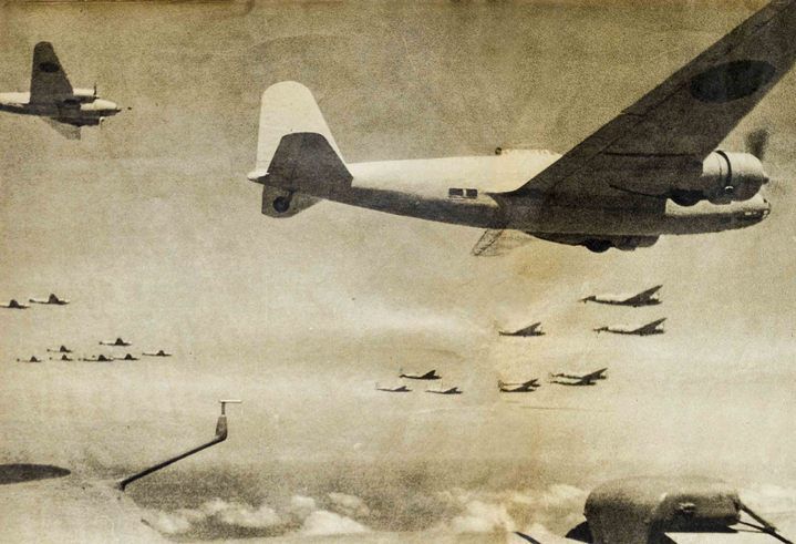 這是侵華日軍大編隊轟炸機羣飛向重慶,準備進行轟炸(資料照片,翻拍)。新華社發