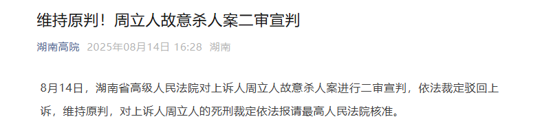 8月14日,湖南省高級人民法院對上訴人周立人故意殺人案進行二審宣判,依法裁定駁回上訴,維持原判,對上訴人周立人的死刑裁定依法報請最高人民法院核准。