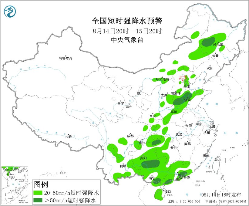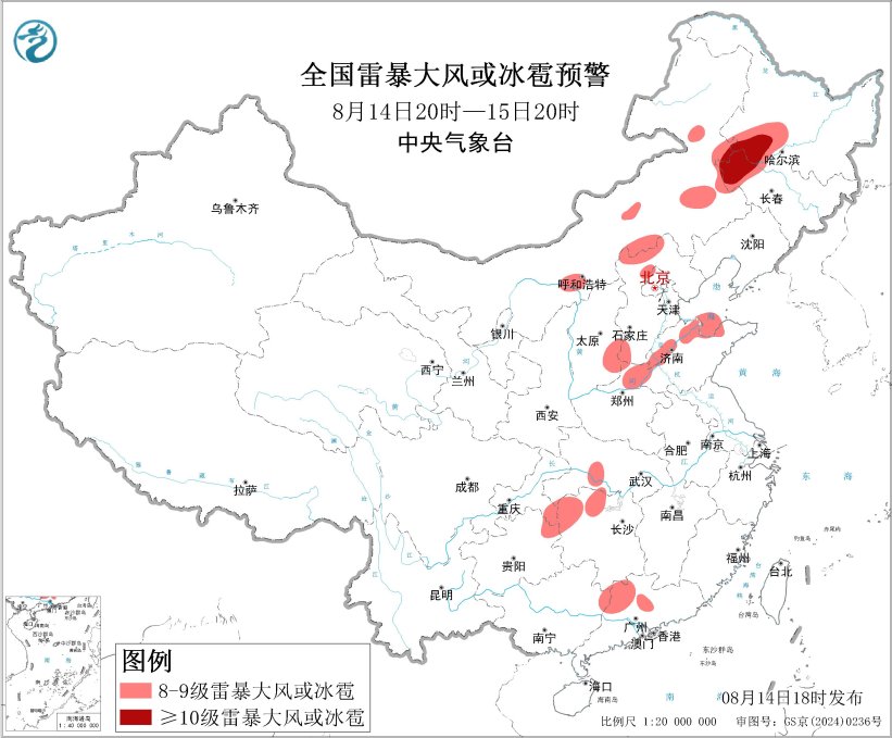 預計8月14日20時至15日20時,內蒙古中東部、東北地區西部、華北西北部和南部、河南北部、山東北部、重慶東南部、湖北南部、貴州東北部、湖南西北部、華南北部等地的部分地區將有8級以上雷暴大風或冰雹天氣,其中,黑龍江西南部、吉林西部等地的部分地區將有10級以上雷暴大風,最大風力可達11級以上;內蒙古中東部、東北地區中西部、華北中東部和南部、陝西南部、華中北部和西部、山東北部、西南地區中東部、華南等地的部分地區將有小時雨量大於20毫米的短時強降水天氣,其中,黑龍江西南部、吉林西部、河北南部、山東西北部、河南北部、重慶東南部、湖南西北部、貴州南部、廣西北部和南部、廣東南部等地的部分地區小時雨量大於50毫米,最大可達70毫米以上。