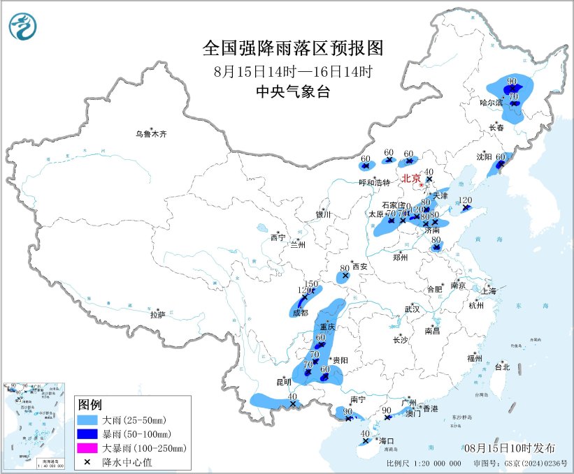 預計,8月15日14時至16日14時,黑龍江中南部、吉林中部和東南部、遼寧東部、內蒙古中部、山西中部、河北中南部、北京東部和北部、天津南部、山東北部、陝西南部、四川盆地東部和西北部、重慶中西部、貴州中西部、雲南東部和南部、廣西西部和南部沿海、廣東西南部沿海、海南島等地部分地區有大到暴雨,其中,河北南部、山東半島北部、四川盆地西北部以及兩廣沿海等地局地有大暴雨(100~150毫米)。上述部分地區伴有短時強降水(最大小時降雨量20~50毫米,局地可超過80毫米),局地有雷暴大風等強對流天氣。