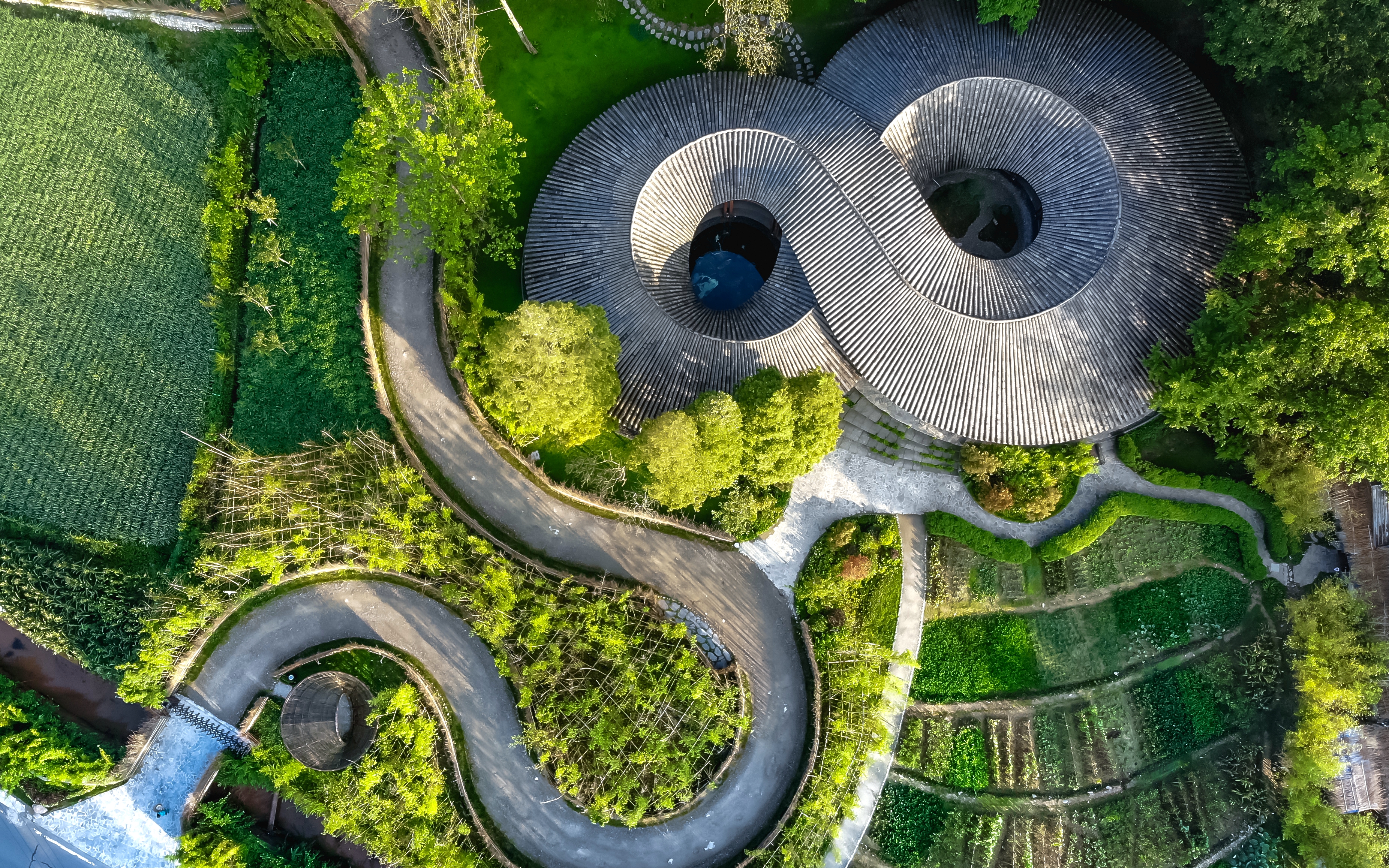 日暮時分,竹藝村的地標性建築“竹裏”被覆上一層金輝。從空中俯瞰這個坐落在竹藝村的“網紅”建築,形狀如同數學符號中代表無窮的“∞”。竹文化無窮,竹編路無限,讓人不禁期待竹藝村更加精彩的未來……