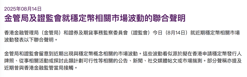 【環球網財經綜合報道】8月14日,香港金融管理局(金管局)與證券及期貨事務監察委員會(證監會)發表聯合聲明,呼籲公眾對近期與穩定幣相關的市場波動保持謹慎,避免因市場炒作或價格走勢而作出非理性投資決策。