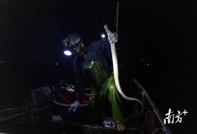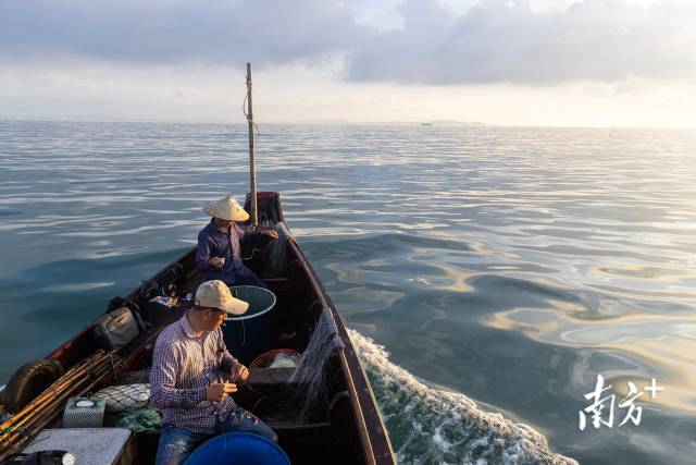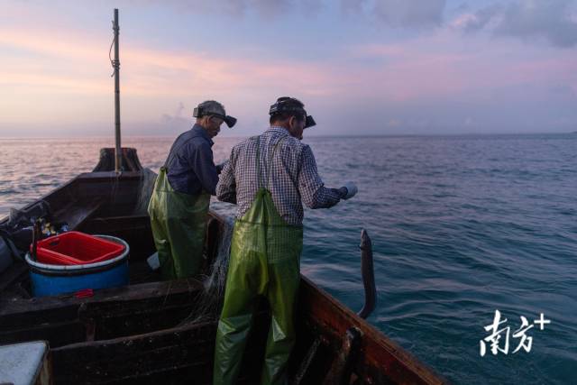 漆黑的夜色中,小船向着大海駛去,只聽見馬達的響聲。船上已是忙碌景象,53歲的哥哥楊英烈船尾掌舵,經驗豐富的他不需要看定位儀,就能把船開到魚羣最多的礁石羣上方,49歲的弟弟楊舉波戴着頭燈正在切魚餌,超叔則在船頭整理放釣的魚鈎,年過七十的他雙手比年輕人都靈活,處理數十個魚鈎遊刃有餘。