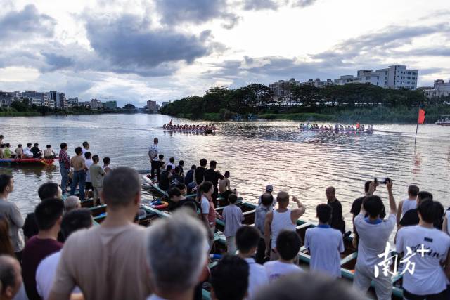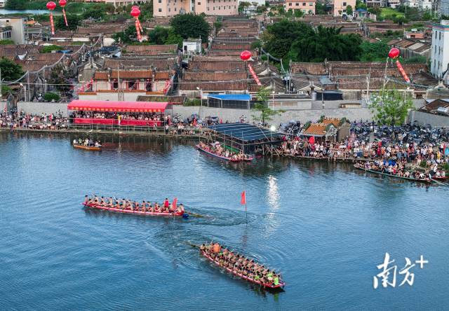 30人、8圈、400米、上下半場……隨着一聲哨響,密集的鼓點打破了江面的平靜,槳葉整齊劃一翻飛,兩條龍舟如離弦之箭劈開碧波。船上,盡是兩村精挑細選的壯實後生,古銅色的臂膀肌肉緊繃,眼裏閃着不服輸的光。岸上,阿公阿婆搖着蒲扇,父母扶着孩子,年輕姑娘踮着腳尖,所有人的目光都在追隨着江心的舟影。