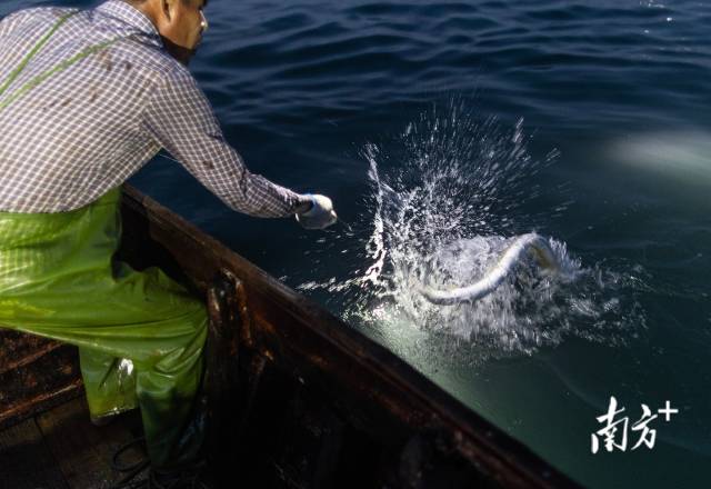 凌晨4時,開始收釣,小船緩慢移動,超叔和楊舉波快速而有節奏地提線,不時有漁獲上鈎。天色逐漸由漆黑到靛藍再到橙紅,太陽也慢慢從海面升起,很快金黃的陽光變得刺眼,這場凌晨漁作共收穫30多條大小鰻魚、黃鰭鯛等。水善利萬物而不爭,辛勤的人們總能得到大自然的犒賞。