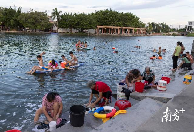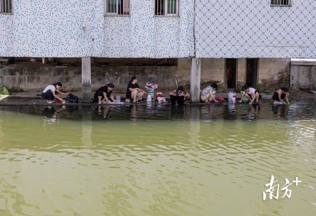 村裏的前溪是練江的支流,陳喜亮與一位洗菜的阿伯聊起家常,旁邊的婦女們也在邊聊天邊洗衣物,幾個孩子正準備釣水裏的小魚。很難想象,十年前這裏還滿是水浮蓮和垃圾,惡臭難聞。