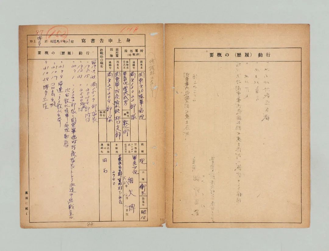 731部隊成員細矢博的《身上申告書》(影印件)。(受訪者供圖)