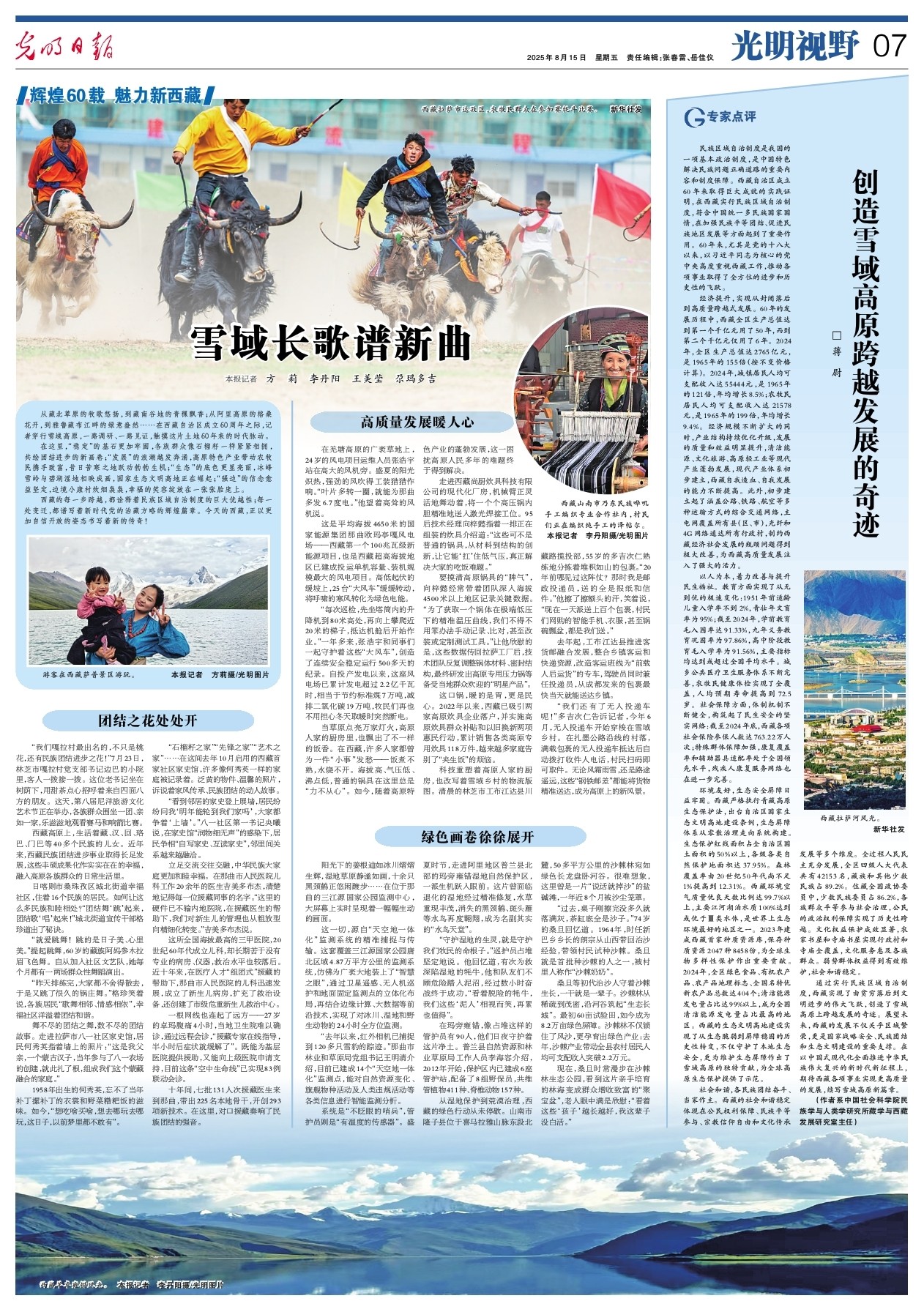 在這裏,“穩定”的基石更加牢固,各族羣眾像石榴籽一樣緊緊相擁,共繪團結進步的新畫卷;“發展”的浪潮越發奔湧,高原特色產業帶動農牧民攜手致富,昔日苦寒之地躍動勃勃生機;“生態”的底色更顯亮麗,冰峯雪嶺與碧湖濕地相映成畫,國家生態文明高地正在崛起;“強邊”的信念愈益堅定,邊境小康村炊煙裊裊,幸福的笑容綻放在一張張臉龐上。
