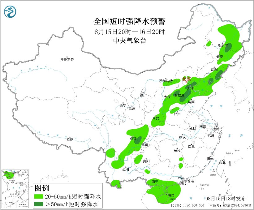 預計8月15日20時至16日20時,東北地區中部和南部、華北等地的部分地區將有8級以上雷暴大風或冰雹天氣,其中,山西東部、河北南部、天津北部、河南北部等地的部分地區將有10級以上雷暴大風;東北地區大部、華北中南部、西北地區東南部、西南地區東部、華南南部等地的部分地區將有小時雨量大於20毫米的短時強降水天氣,其中,黑龍江南部、遼寧東部和南部、山西東部、河北中南部和東北部、天津、四川中東部等地的部分地區小時雨量大於50毫米,最大可達80毫米以上。