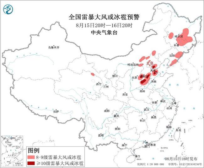 預計8月15日20時至16日20時,東北地區中部和南部、華北等地的部分地區將有8級以上雷暴大風或冰雹天氣,其中,山西東部、河北南部、天津北部、河南北部等地的部分地區將有10級以上雷暴大風;東北地區大部、華北中南部、西北地區東南部、西南地區東部、華南南部等地的部分地區將有小時雨量大於20毫米的短時強降水天氣,其中,黑龍江南部、遼寧東部和南部、山西東部、河北中南部和東北部、天津、四川中東部等地的部分地區小時雨量大於50毫米,最大可達80毫米以上。