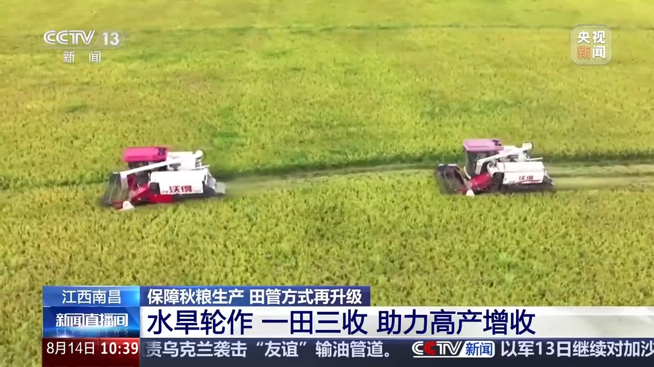 在江西南昌聯圩鎮,一茬茬飽滿的稻穗被迅速收割、脱粒,裝入運輸車輛。而在收割機作業的田塊旁,翻耕起壟機正加緊作業,農户們忙着清溝除雜、整理田地,為播種優質高產大豆做足準備。今年當地採用水旱輪作、一田三收的種植方式,春季種水稻,初秋收完水稻後搶種大豆,秋末大豆收穫後緊接着種植耐寒蔬菜或油菜,三季作物茬口緊密銜接,全年無閒田。同時,通過推廣良種、測土配方施肥等技術,確保每種作物都能優質高產。