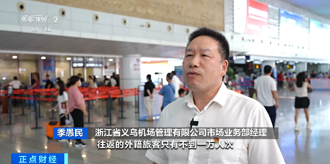浙江省義烏機場管理有限公司市場業務部經理 季愚民:以義烏到廣州的航線為例,去年七月,往返的外籍旅客只有不到一萬人次。但是今年七月呈爆發增長,這條航線往返的外籍旅客達到了2.57萬人次。